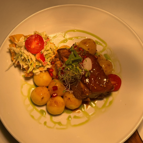 wolno gotowane udko z kaczki, smażone kopytka, sos własny na bazie tłuszczu z kaczki, buraczki